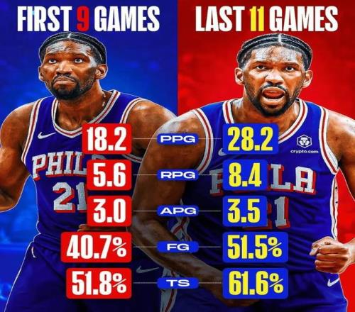 而有意思的是,费城76人虽然两大核心恩比德和保罗-乔治受到伤病困扰,但球队在马克西和新科探花秀VJ-埃奇库姆两大‘后场双枪’的率领下,一度打进过东部前三,目前费城以22胜16负的战绩,排在东部第5位。好消息是,随着比赛的深入,恩比德状态回暖明显,近11场比赛,场均可以砍下28分8篮板,投篮命中率51%,虽尚未完全回归巅峰,但对于目前的费城来讲,已经属于超预期的惊喜了。