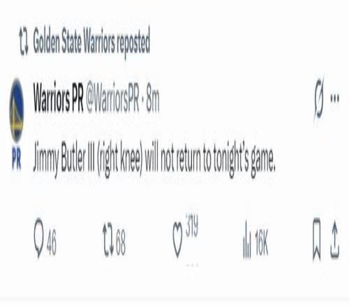 勇士官方宣布巴特勒因为右膝受伤此役不会回归。