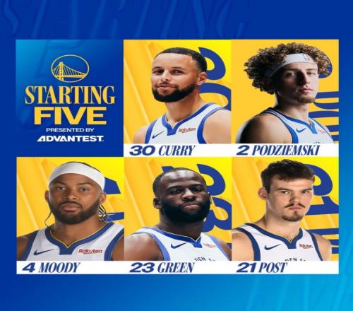 勇士首发:库里、波杰姆斯基、穆迪、追梦格林、波斯特。