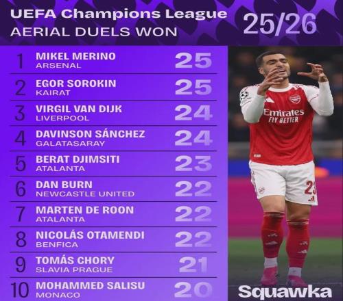 Squawka统计,本赛季欧冠至今为止争顶成功次数最多(并列)的球员是梅里诺:25次。