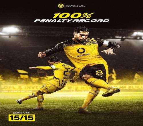 至此,自加盟多特蒙德以来,埃姆雷-詹代表球队在各项赛事15次主罚点球全部打进,命中率100%,其中包括德甲12次,欧冠2次,德国杯1次。