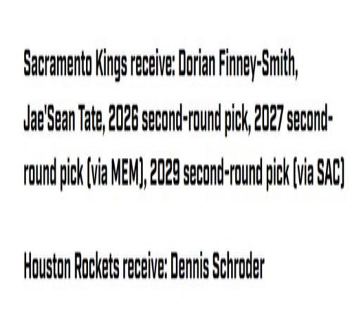 国王得到:芬尼史密斯+泰特+26年火箭二轮+27年灰熊二轮+29年国王二轮;